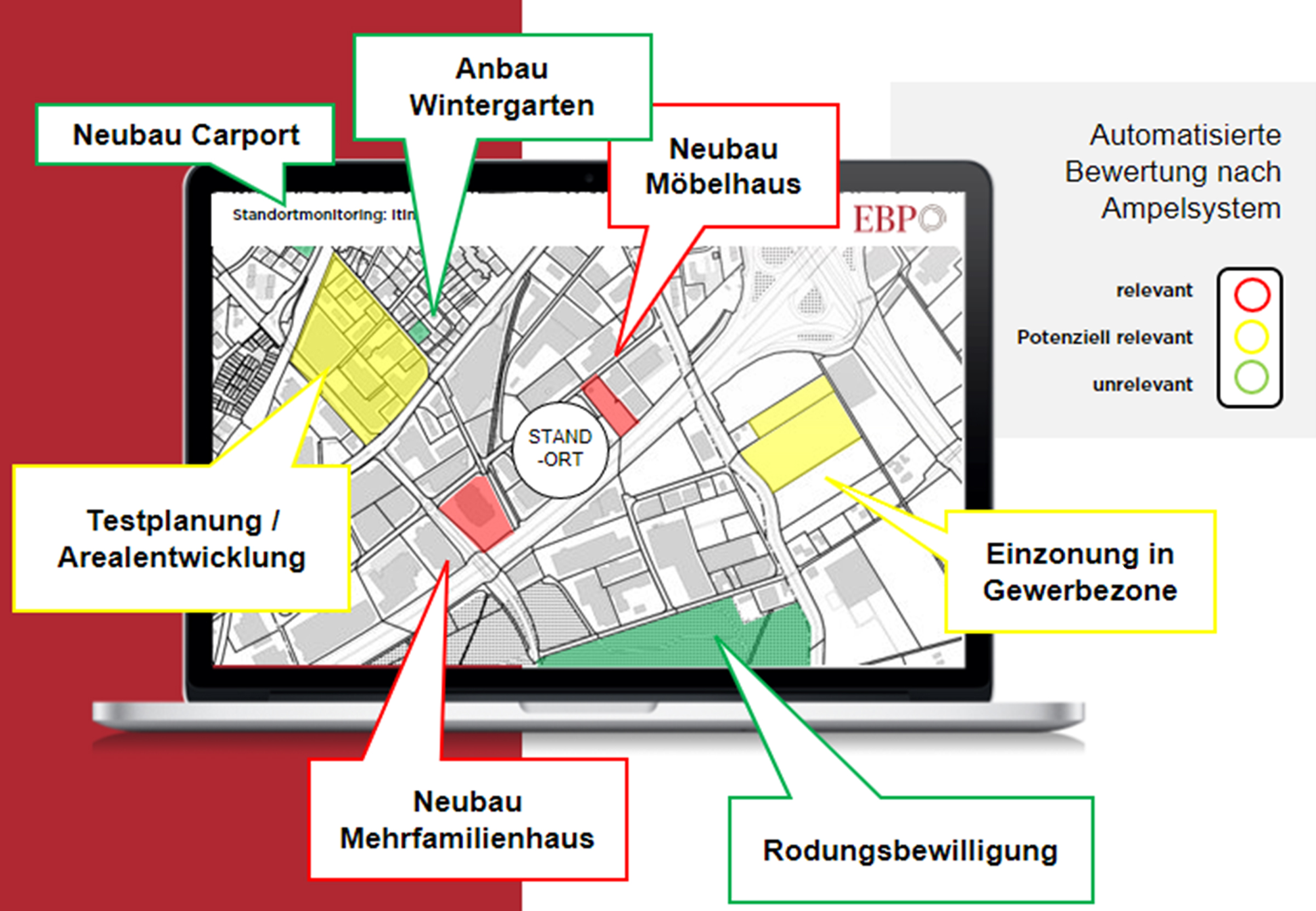 Having an overview of the pending building projects in the vicinity of your company location is indispensable for constructive, early-stage dialogue with all the relevant stakeholders. When it comes to municipal and cantonal planning, it can also be highly advantageous to receive information about the specific projects early on. Public consultation requirements, for example, offer you an opportunity to introduce your own immediate and long-term concerns; that is, if you are aware of the consultation period. However, the search for all the necessary information is complex and time-consuming, and the risk of missing something important is great.