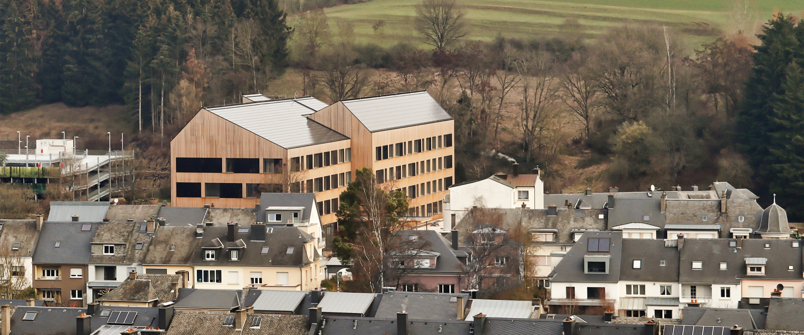 The specifications submitted by the Luxembourg government officials for this project were demanding. The new building for the Secondary School for Health Professions (Lycée technique pour professions des santé) was to be designed to generate a net-positive energy balance. Given that the energy balance also takes account of embodied energy, the building is to produce more energy over the course of its lifecycle than the energy consumed for its construction, opera-tion and removal.
