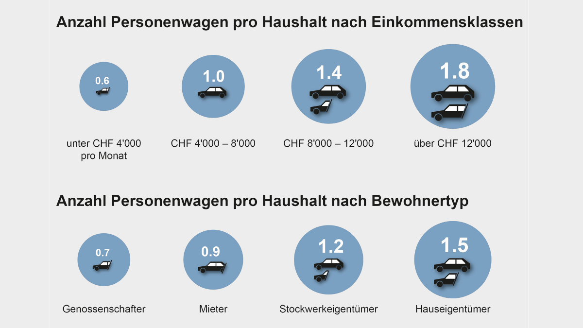 However, the interests involved are to some extent in flux. In large cities today, fewer than half of all households have access to their own vehicle. It follows that builder-owners in such urban areas, as well as in other areas offering easy access to public transportation, have begun to prefer building fewer parking spaces than the numbers specified in city and municipal regulations. As it turns out, underground parking spaces are expensive and difficult to rent out at cost. A recent analysis of rental agreements accounting for 21,000 properties indicates considerable rental losses for investors in new construction projects. Indeed, real estate experts see a need for action. The largest rental revenue shortfalls for parking spaces are seen in small and medium-sized agglomerations. In certain circumstances, some cantons and cities have already begun to encourage the realization of fewer parking spaces than the reference number.
